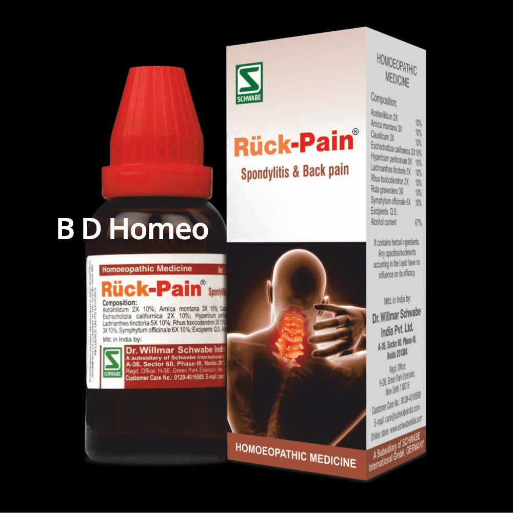 Rück-Pain® – মূলত Spondylitis, কোমর ব্যথা ও পিঠের ব্যথার জন্য একটি কার্যকর হোমিওপ্যাথিক ঔষধ। Dr. Willmar Schwabe (Germany) এর আসল ঔষধ এখন বাংলাদেশে সহজেই পাওয়া যাচ্ছে।